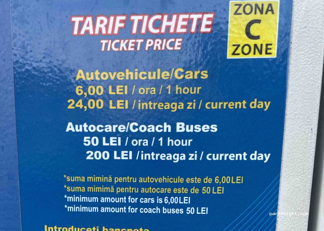Nachts relativ ruhig, Abfallkörbe und WC (2.5Ron) von 8-18h vorhanden. im hinteren Bereich Längsparkplätze für größere Fahrzeuge. Schattig. In wenigen Minuten am Markt. Bezahlung auch über App, sehr bequem