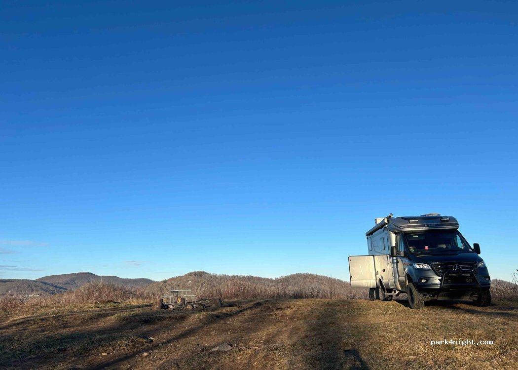 Il y a 2-3 emplacements sur la montagne (1400 mètres d'altitude) avec des tables de pique-nique et un foyer. L'emplacement le plus bas est marqué par la tempête, mais les deux emplacements du haut ont une vue magnifique ! L'emplacement près de la croix est relativement droit ! Emplacement 4x4, car il faut absolument avoir les quatre roues motrices pour les 700 derniers mètres, quelle que soit la météo, car la route de gravier est mauvaise et a de gros nids-de-poule. Nous sommes montés avec notre Sprinter 4x4 sans aucun problème. Il faut traverser un tunnel, donc ne pas aller plus haut que 3,40 m !