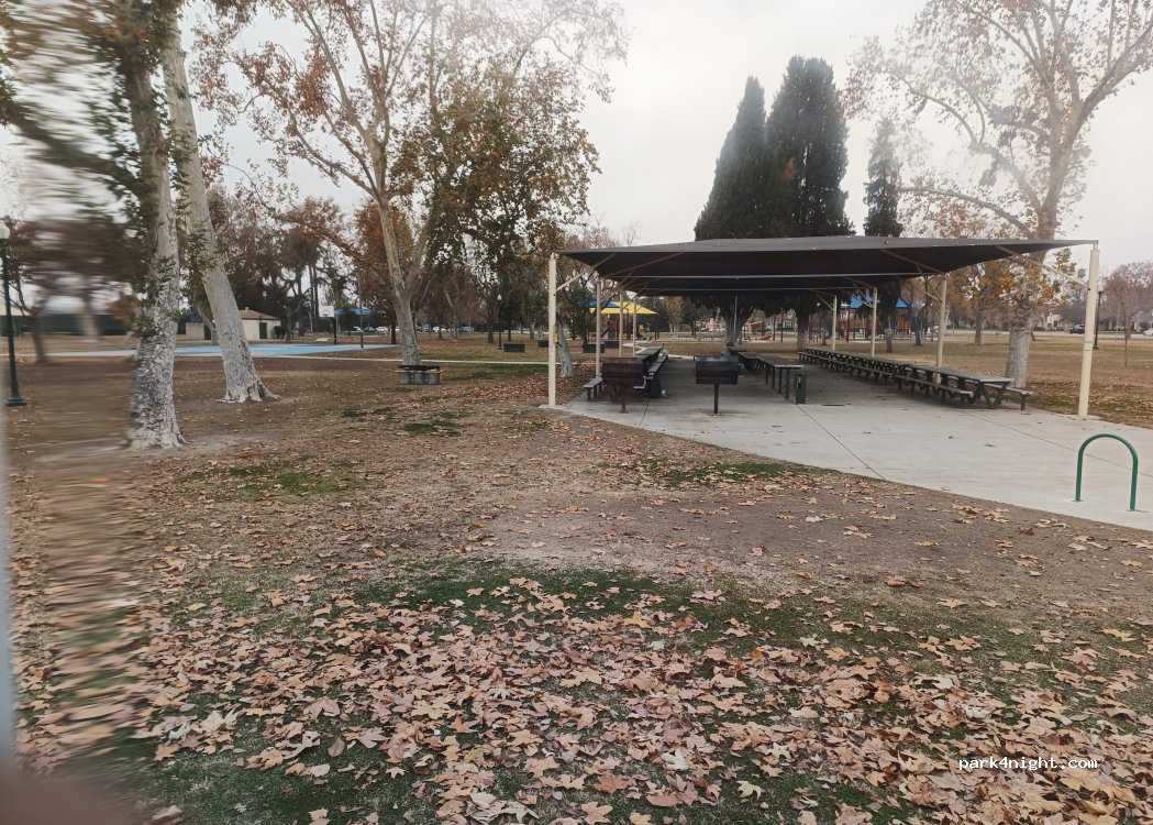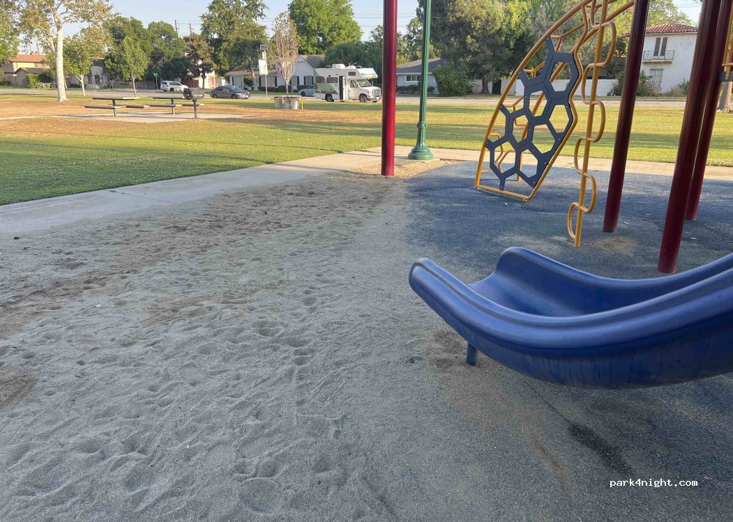 Estacionamiento en la calle a lo largo de un parque, sin prohibición de estacionamiento.
