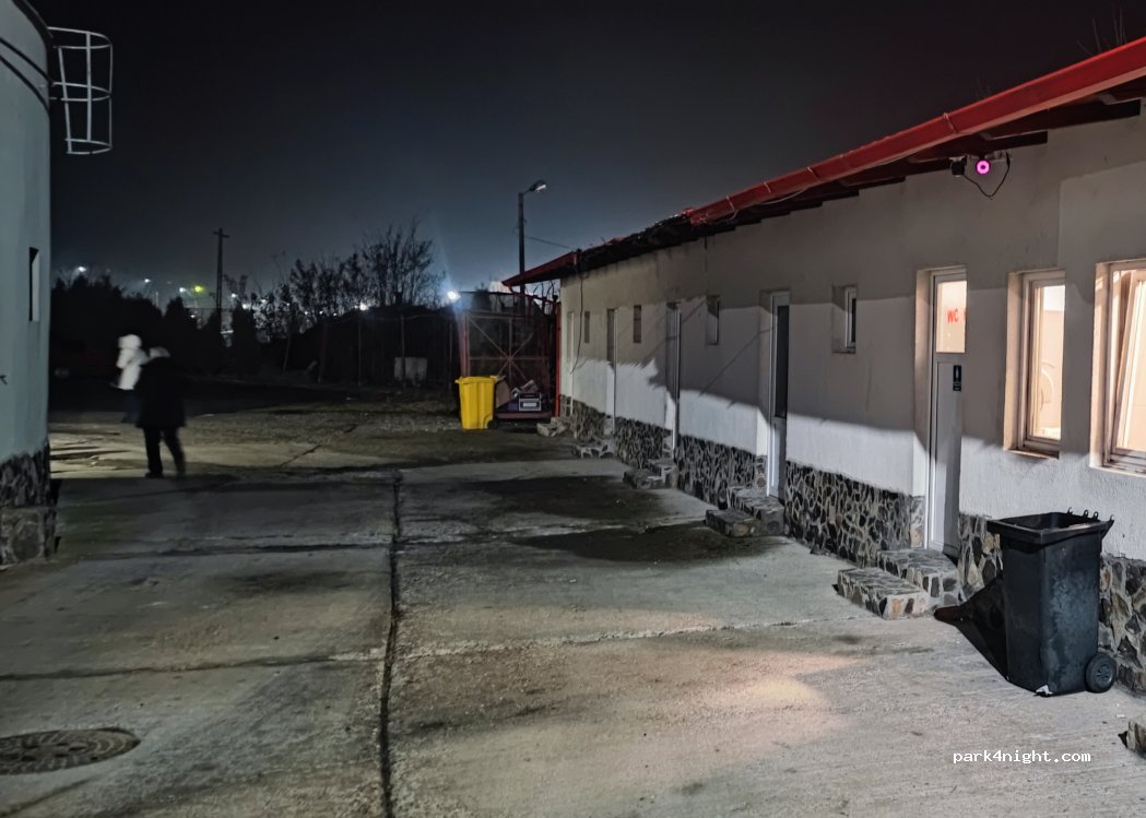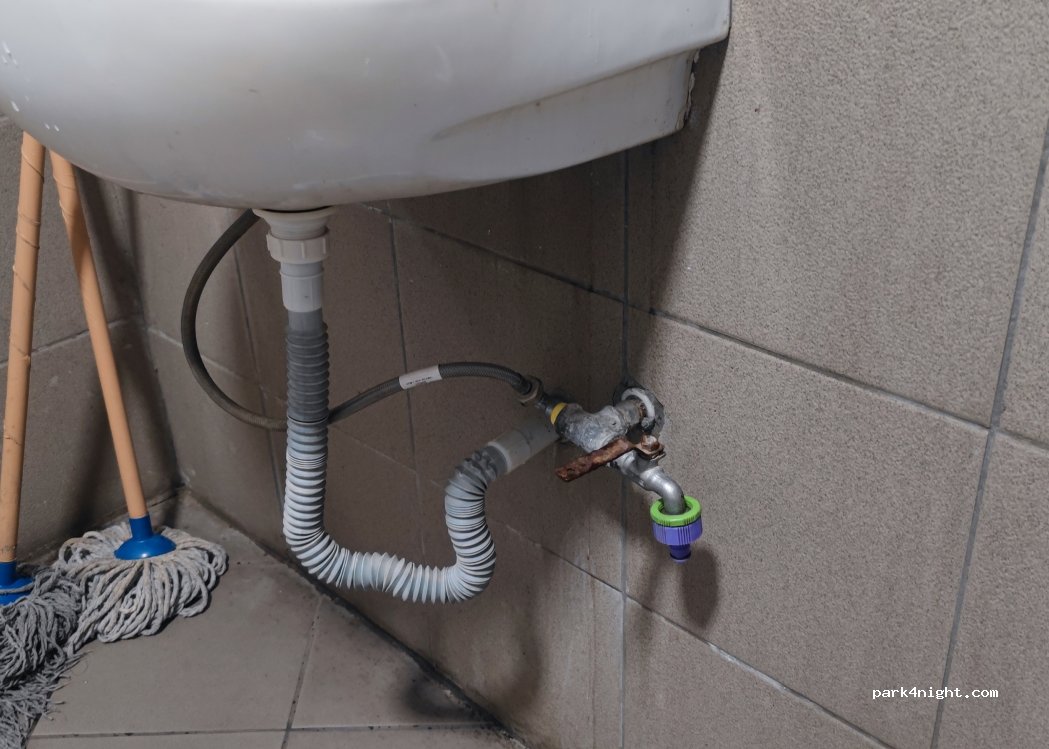 Grifo de agua en el baño de la gasolinera, con buena presión de agua potable. Si tienes varios metros de manguera, puedes llenar el tanque.
