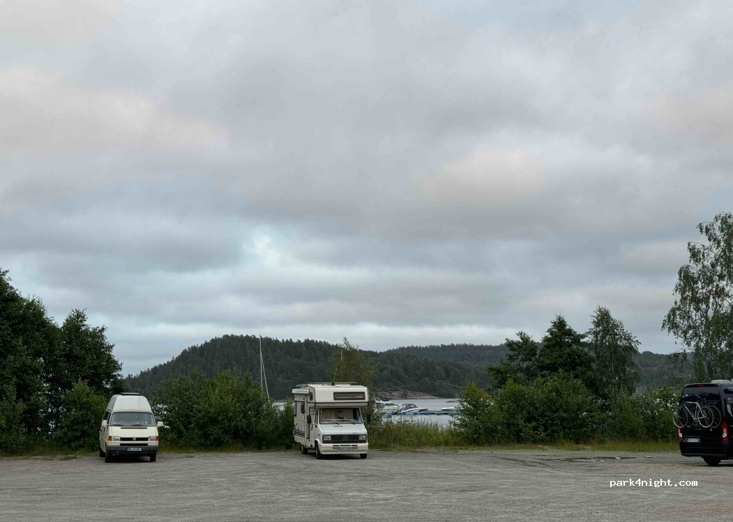 Grand parking avec vue sur le fjord. Le stationnement des camping-cars est autorisé de 19h00 à 9h00.