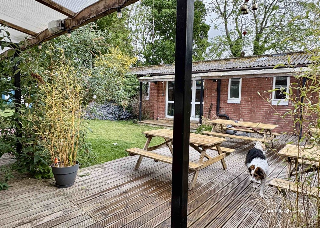 Estacionamiento para pasar la noche en el albergue Wooler. Acceso a baños, duchas, cocina grande con servicio de comidas, sala común grande y muchos asientos al aire libre.