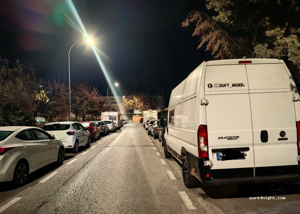 Calle amplia de sentido único con carriles de aparcamiento a izquierda y derecha. Por la noche no hay tráfico y es muy tranquilo. En algunas calles de esta zona está prohibido el estacionamiento de vehículos recreativos, pero aquí está permitido. A unos 20-30 minutos andando del casco antiguo.
