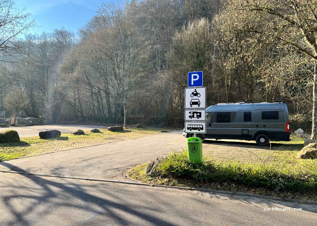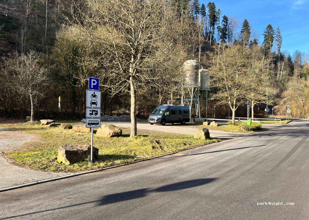 Le parking pour camping-cars se trouve entre la rivière Nagold et la route principale. Au bout de la route se trouve la patinoire Polarion, où l'on peut patiner en hiver. D'avril à octobre, vous pouvez louer des canoës au centre sportif adjacent pour pagayer sur la rivière Nagold. Si le parking est complet, il vous suffit de longer la route ; deux autres grands emplacements sont réservés aux camping-cars, bus, etc. Nous avons déjà fait demi-tour car le parking était bondé. Grâce à un tuyau, nous avons trouvé une place.