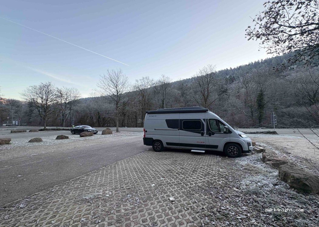 RV parking is located between the Nagold River and the main road. At the end of the road is the Polarion ice rink, where you can ice skate in the winter. From April to October, you can rent canoes at the adjacent sports center for paddling on the Nagold River. If the front is full, just drive along the road; there are two more large areas designated for RVs, buses, etc. We've already turned around because the front was full of cars. Thanks to a tip, we found a spot.