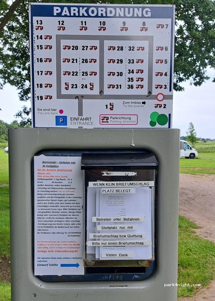 Place de parking Boiensdorf. Bel emplacement juste sur le Salzhaff. Opérateurs très sympathiques qui proposent également une petite collation sur place. Il est à noter que la partie avant est un parking normal et que l'espace de stationnement ne commence que derrière un petit fossé. Saison à partir du 16 avril - 16.10.
