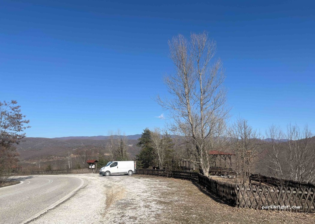 Picnic area parking with nice view, barbecue area and covered picnic tables. On the side of the road but extremely quiet. Very quiet place at this time of year. Flat ground and easily accessible.