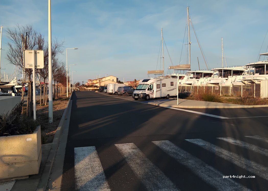 Prohibited at night from 8:30 p.m. to 9:30 a.m. Parking is permitted during the day only. At the port of Leucate, on a quiet street, there are 10/12 parking spaces where motorhomes can park.