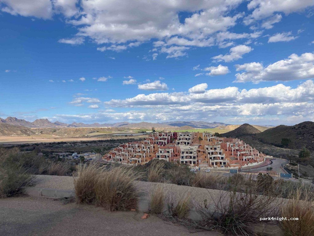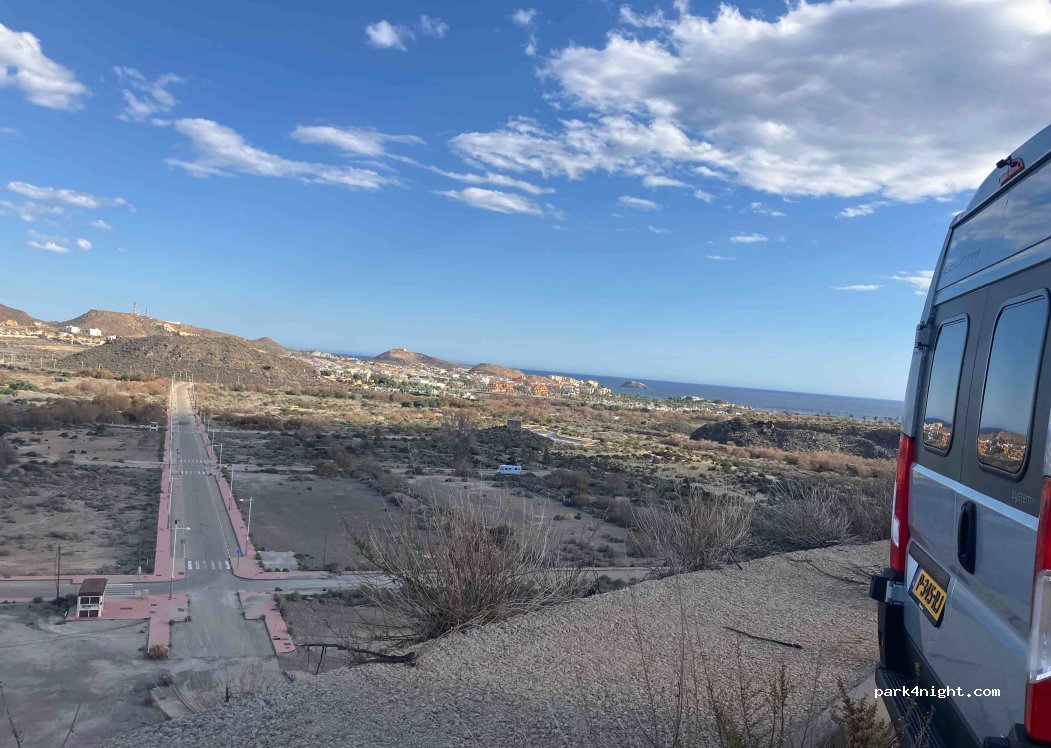 In een soort verlaten gebied staan het en der campers verspreid. Een verlaten doodlopende rondweg hoger heeft prachtig 360gr uitzicht. Vangt wel wind maar het uitzicht maakt veel goed. In het hele gebied kun je makkelijk met meer campers staan maar de solitude maakt het juist af.