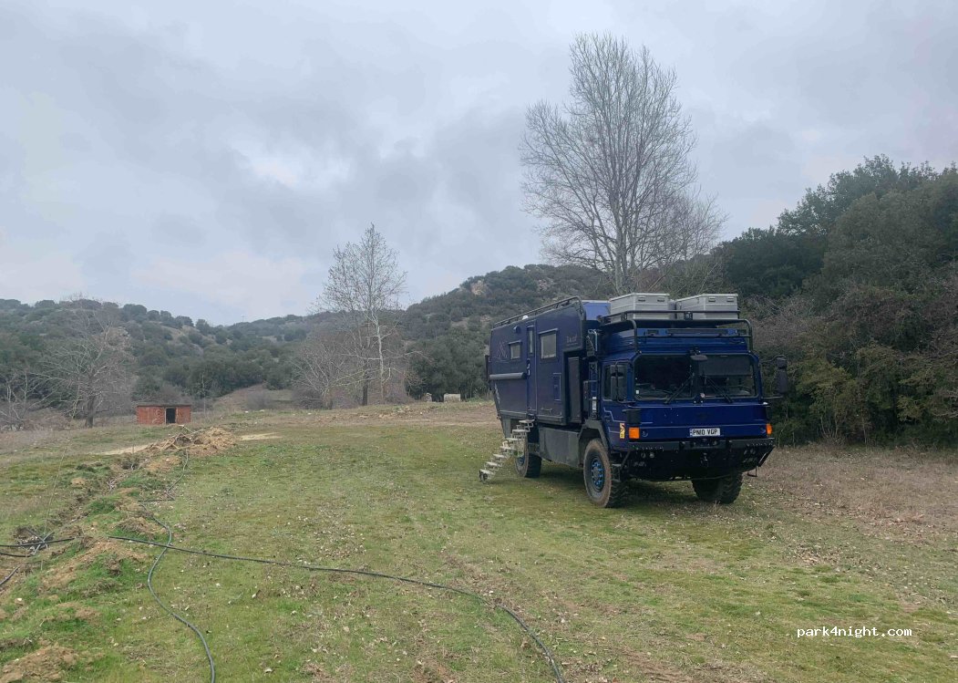 Aire de pique-nique au pied d'une colline qui abrite une église et une autre aire de pique-nique au sommet. Bon chemin pour y accéder, mais s'il a beaucoup plu, attention, le pont sur la rivière peut être inondé selon les panneaux - si c'est le cas, n'essayez pas de traverser ! Nous avons passé une nuit parfaitement calme ici, tout seuls, sans bruit, sans pollution lumineuse et sans chiens/chats errants. Il y a un point d'eau ici, et bien d'autres près de l'église en haut de la colline, mais je ne sais pas si elles sont potables ou non, donc nous n'en avons pas pris - mais ils étaient tous actifs début février. Il y a aussi une grande poubelle ici, alors utilisez-la plutôt que de laisser des choses par terre (heureusement, c'est très propre ici). Nous y sommes allés dans un camion d'expédition de 15 t et 10 m de long, donc tout arrivera ici et vous n'avez pas besoin de garde au sol car la piste est bonne. Il y a de l'herbe dans la zone pour se garer, bien que vous puissiez vous arrêter avant sur une piste de gravier. Si vous allez sur l'herbe, ne le faites évidemment pas si elle est très mouillée, sinon vous la retournerez ou risquerez de rester coincé.