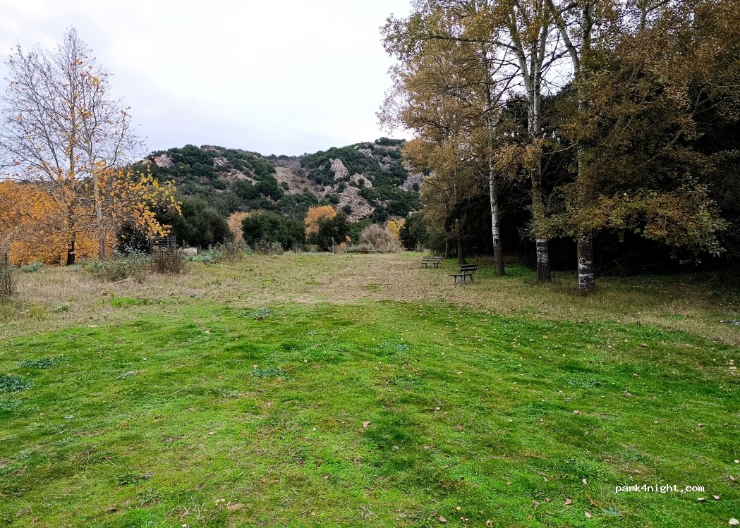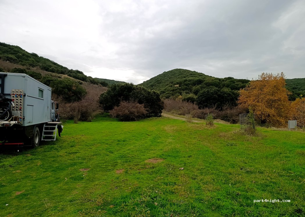 Área de picnic en la base de una colina que tiene una iglesia y otra área de picnic en la cima. Buen camino para llegar, pero si ha llovido mucho, ten cuidado, el puente sobre el río puede estar inundado según las señales; si es así, ¡no intentes cruzar! Pasamos una noche perfectamente tranquila aquí, completamente solos, sin ruidos, sin contaminación lumínica y sin perros o gatos callejeros. Hay un punto de agua aquí, y muchos más junto a la iglesia en la colina, pero no sé si son potables o no, así que no cogimos nada, pero todos estaban activos a principios de febrero. También hay un contenedor grande aquí, así que úsalo en lugar de dejar cosas en el suelo (afortunadamente aquí está muy limpio). Accedimos en un camión de expedición de 15 t y 10 m de largo, por lo que cualquier cosa llegará aquí y no necesitas espacio libre sobre el suelo porque la pista es buena. Hay césped en la zona para aparcar, aunque podrías parar antes en una pista de grava. Si vas al césped, obviamente no lo hagas si está muy húmedo, de lo contrario lo revolverás o correrás el riesgo de quedarte atascado.