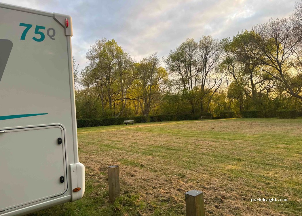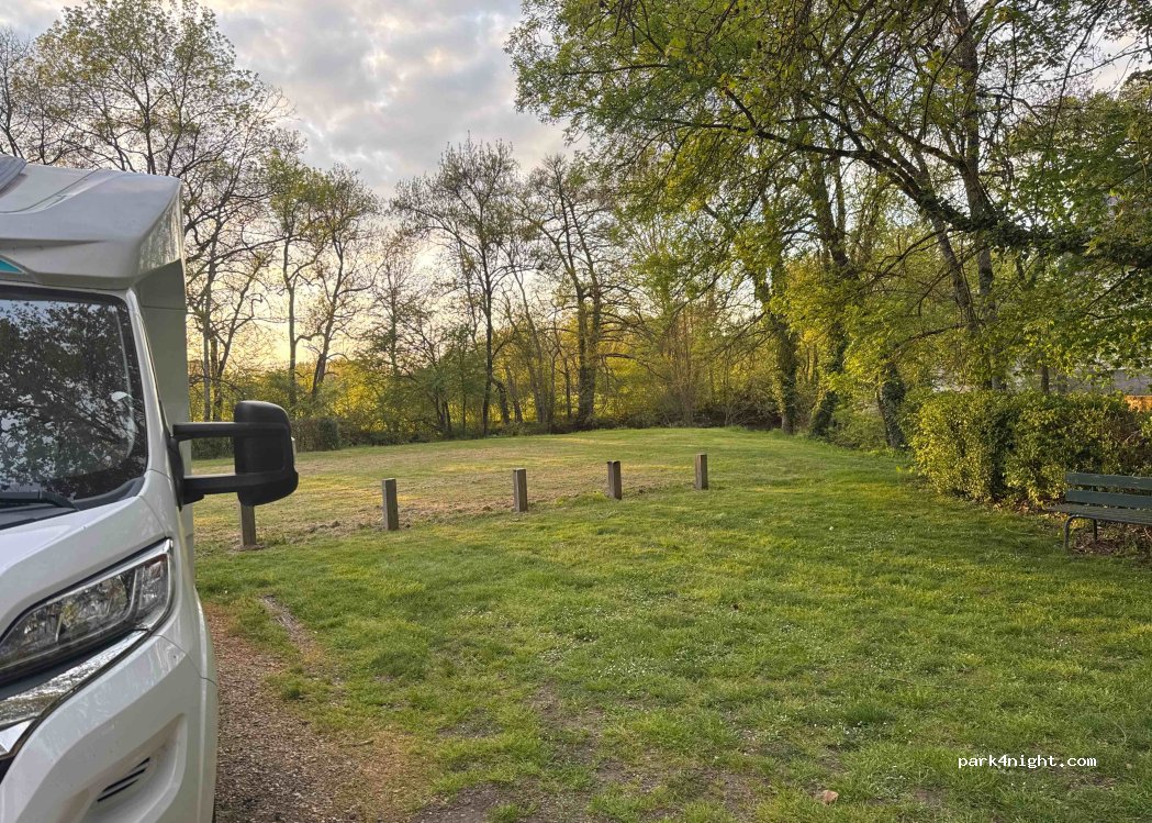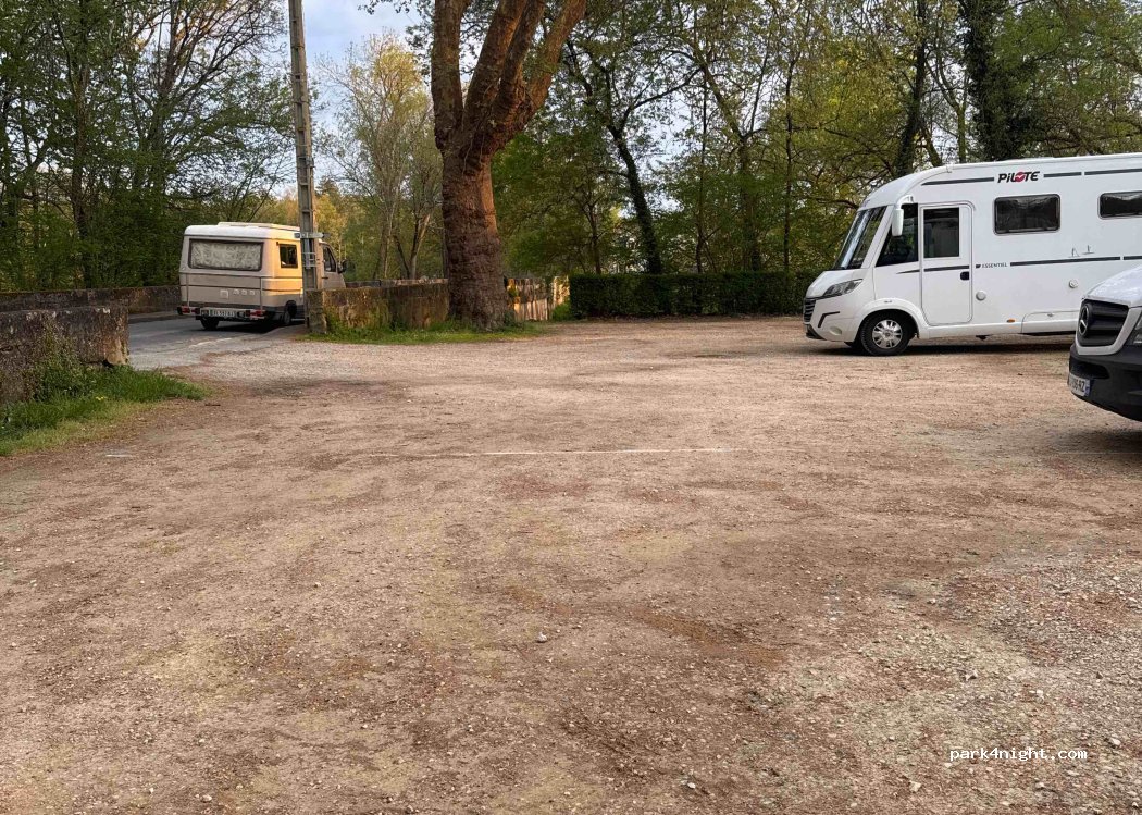 Aire de pique-nique avec parking pour 5 ou 6 camping-car, une réservée aux personnes handicapées, ainsi que l'une des deux, tables existantes. Ombre, ferme et niveau plat. Sans service et avec limite de stationnement de 24h. De l'autre côté de la rivière, il y a une autre zone verte avec beaucoup de camping-cars pleinement déployés, mais nous ne savons pas si c'est pour une journée ou plusieurs.