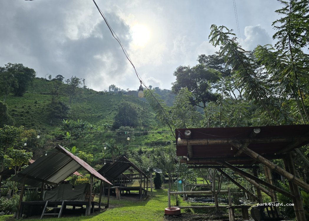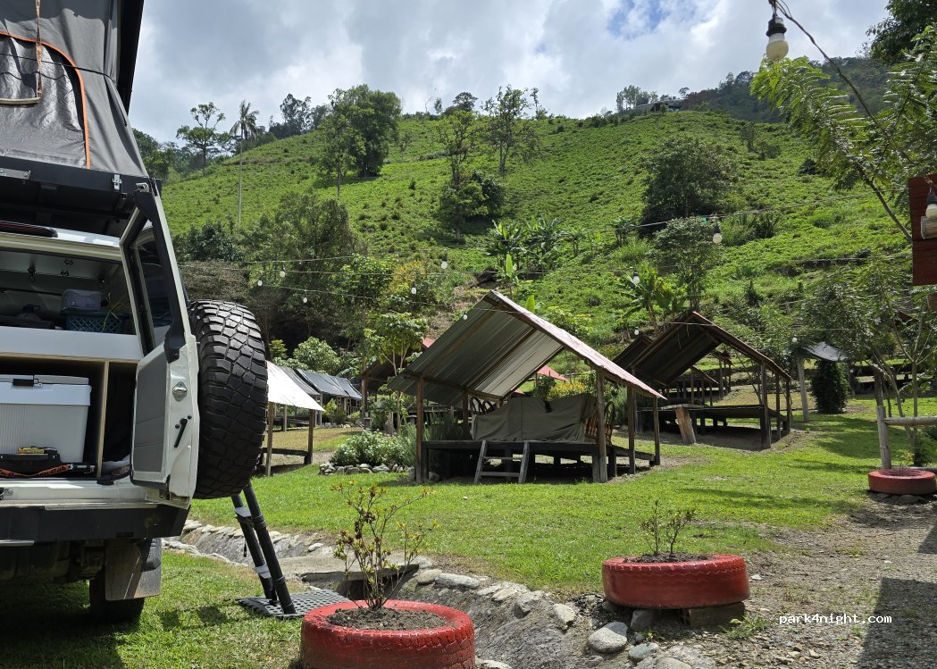 L'installation est très bien entretenue, tend à être de niveau européen. Trois véhicules peuvent se garer sur la propriété, tout le reste est des cabanes ouvertes, camping sous le toit, sans tente.