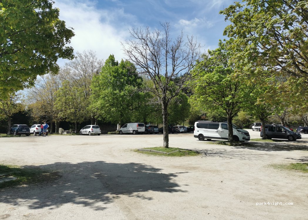 Grand parking plat avec de l'ombre en journée. Possibilité de stationner pour dormir du côté opposé à la route. Parking très poussiéreux quand il fait sec. Nuit calme.