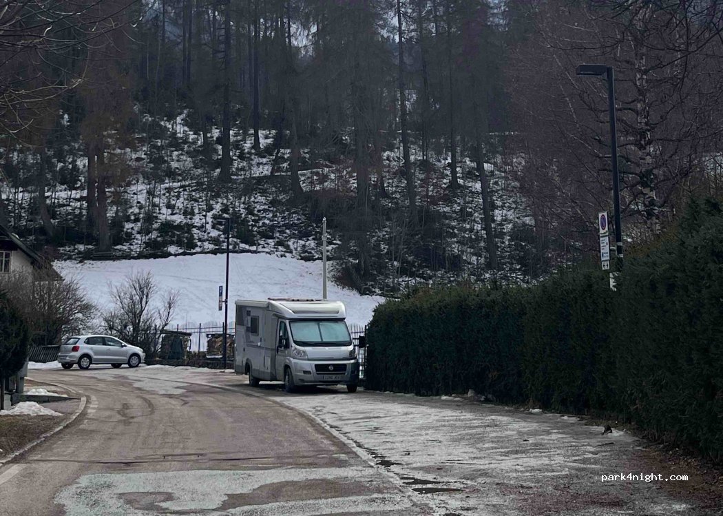 Free parking for 180 minutes with disc and perfect for seeing the village 5 minutes walk away. Relatively flat, on dirt and next to a secondary road with little traffic in winter. Suitable for 7m vehicles. We did not stay overnight, but it seems a quiet residential area.