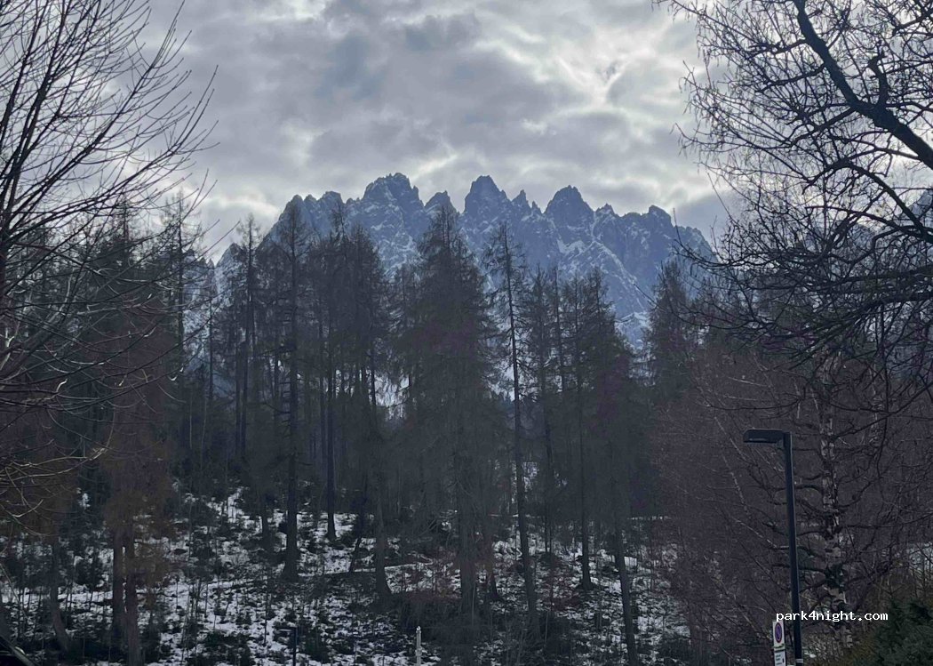 Parcheggio gratuito per 180 minuti con disco orario, perfetto per visitare la città, distante 5 minuti a piedi. Relativamente pianeggiante, su sterrato e adiacente a una strada secondaria poco trafficata in inverno. Adatto per veicoli da 7 m. Non abbiamo pernottato, ma sembra una zona residenziale tranquilla.