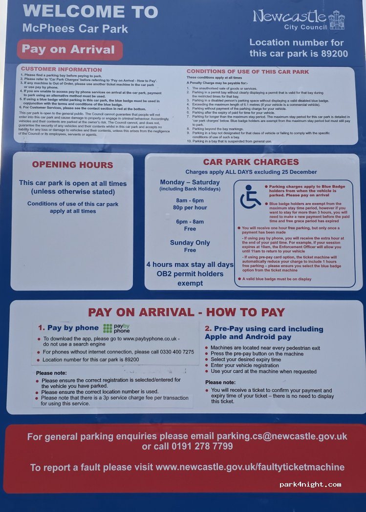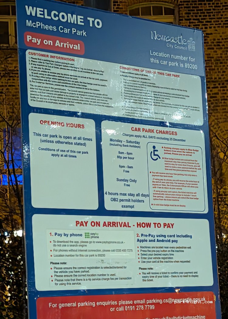 McPhees Car Park. Chargable car park during the daytime with a maximum stay of 4 hours between 8am and 6pm after which parking is free. I paid for 1 hour of parking at 5pm and it expired at 8am.