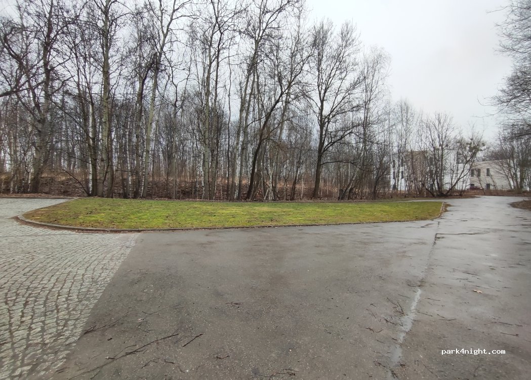 Pequeño estacionamiento cerca de un pequeño bosque.