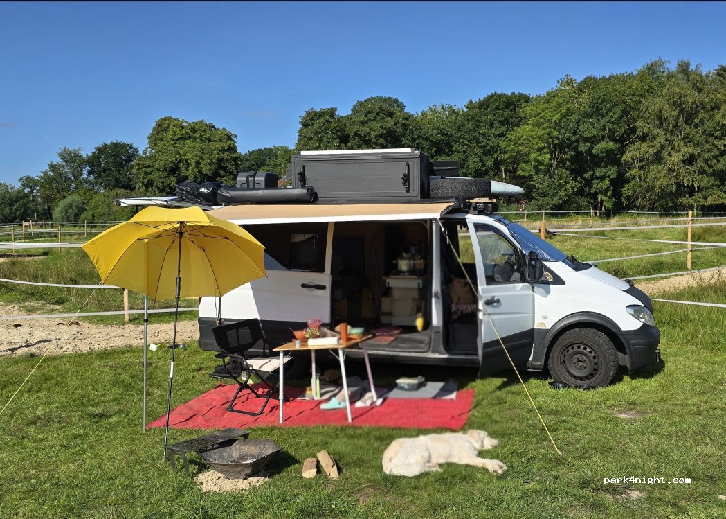 Superbe emplacement, au milieu des champs et des chevaux nuit au calme. Accueil chaleureux on est venu nous chercher à vélo pour nous conduire à notre emplacement je recommande danke