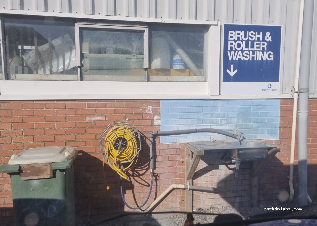 Wasseranschluss mit Schlauch neben dem Waschbecken, ausgeschildert mit „Bürsten- und Rollenwaschen“ (50.79177, -1.03296).