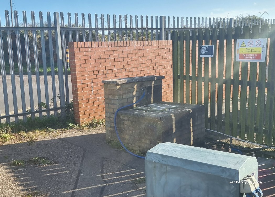 Toilettes et vidange des eaux usées à l'intérieur de la clôture, près du portail d'entrée, et poubelles (entrée étroite) au 50.79152, -1.03297.