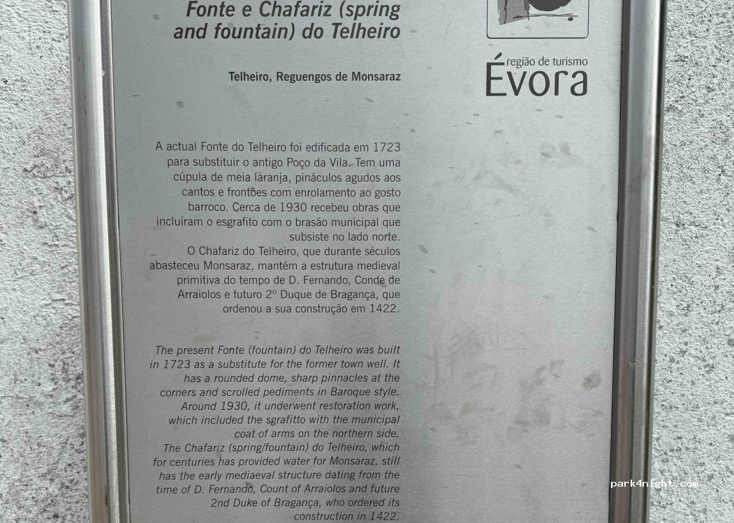 Fontaine « Fonte do Telheiro » dans le village de TELHEIRO, à 100 m de l'aire de service. L'eau est toutefois déconseillée (débit et goût excellents). En cas de doute, testez-la ! Accès facile pour les véhicules.