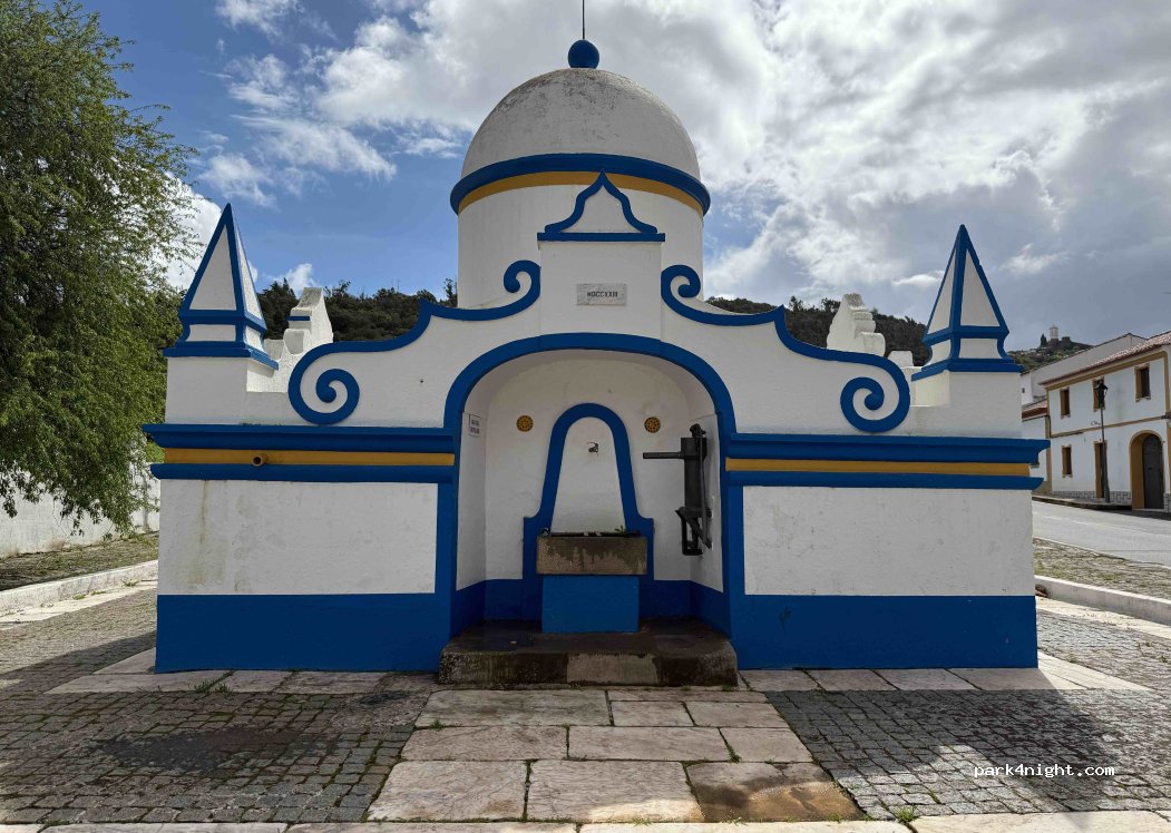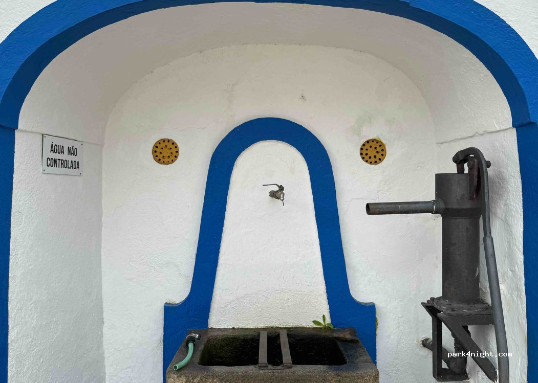 “Fonte do Telheiro” fountain in TELHEIRO village, 100 m away from service area, but advised as NOT controlled water (good flow and tasty). Test it yourself if in doubt! Easy access for vehicles.