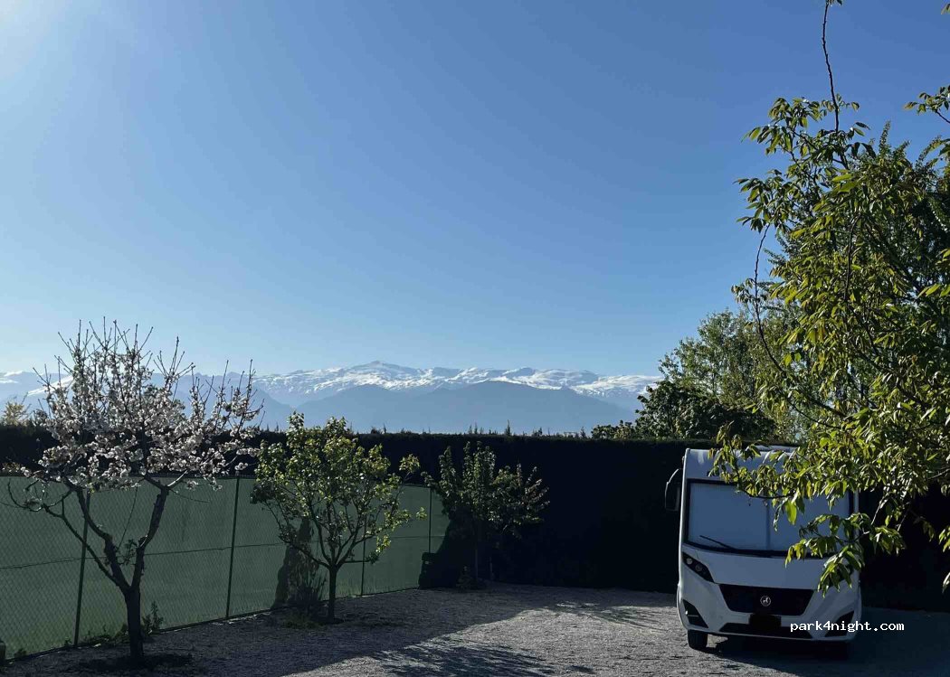 Een camper plaats op een geweldige locatie met uitzicht op de Siërra Nevada. Op de fiets ben je met 15 min. in de binnenstad van Granada en ook supermarkten zijn met 15 fietsminuten te bereiken. Qua voorzieningen is er nog niets, maar daar wordt aan gewerkt. Hartelijk welkom geheten door Blanca. Voor wie echt dichtbij de stad Granada wil staan is dit de perfecte plek.