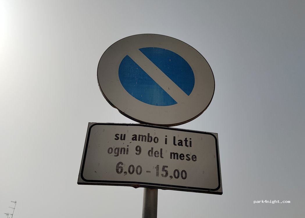 Parking without services near a sports field in a residential area, nearby there is a supermarket and bars and pizzerias. There is a sign of no parking for a monthly market, no problem on other days.