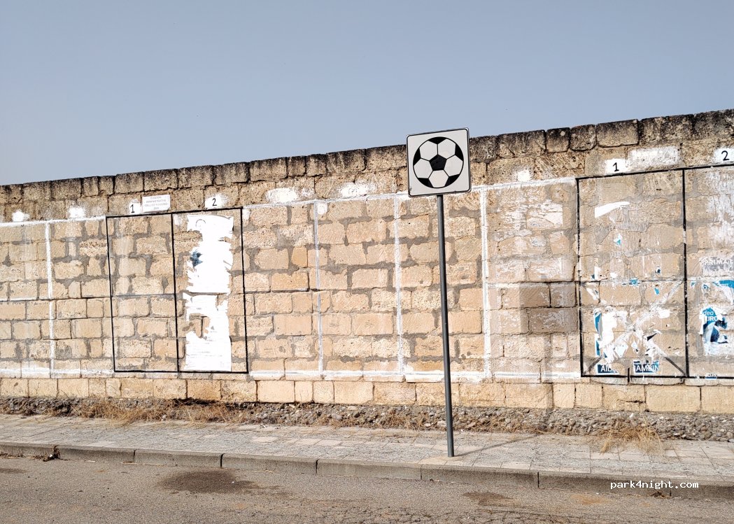 Aparcamiento sin servicios cerca de un campo deportivo en una zona residencial. Cerca hay un supermercado, bares y pizzerías. Hay un cartel que prohíbe aparcar debido a un mercado mensual; no hay problema los demás días.
