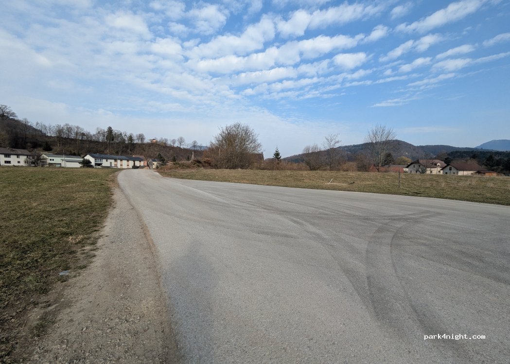 Große asphaltierte Fläche in einer nicht beschilderten Sackgasse einer kleinen Siedlung zwischen Feldern und einem Fluss.