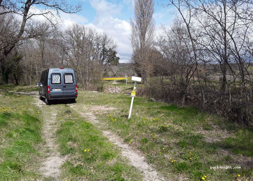 Après le point du spot descendre 200m . Petit coin a l'ombre sous les arbres près d'un ruisseau. Faire attention aux culture environnante....ruches vignes et lavande .respect pour les agriculteurs ..calme et plat , préférable vans et fourgons chemin un peut délicat .