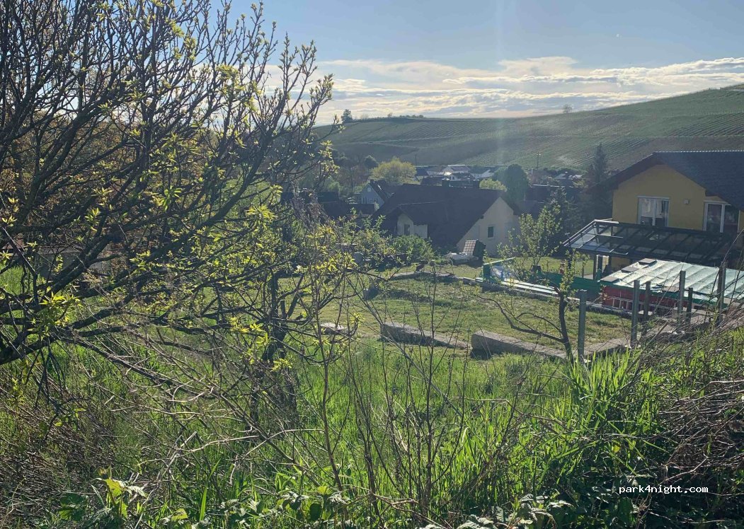 Mooie plek (zicht op wijngaard) bij betonplaat achter schuur van de Weingut. Je kunt zo naar boven de wijngaarden inlopen. Lekker gegeten in het bijbehorende restaurant. Vonden het niet goedkoop. Rustige nacht gehad.
