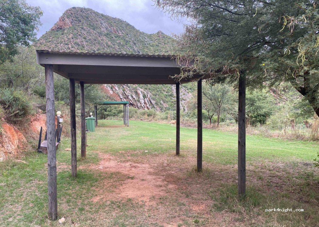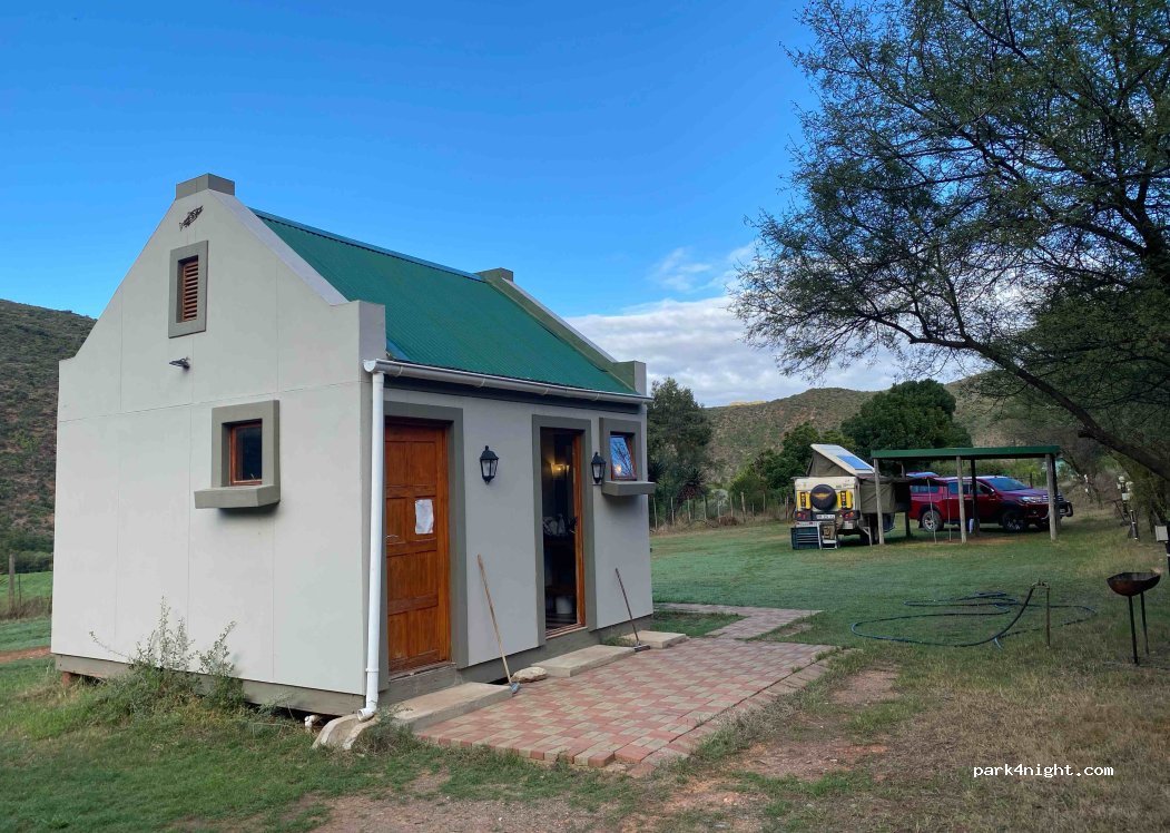 Swartbergen op 150 meter van de doorgaande weg. 10 plaatsen met stroom, douche en water. 3 plaatsen met een dak tegen regen of zon. Plaatsen met gras en uitzicht op de bergen. Vanaf de middag ligt de camping in de schaduw van de bergen. Het toiletgebouw is modern met handdoeken voor de gasten. Het dorp De Rust met toeristische winkels en een restaurant ligt op 1,5 km afstand.