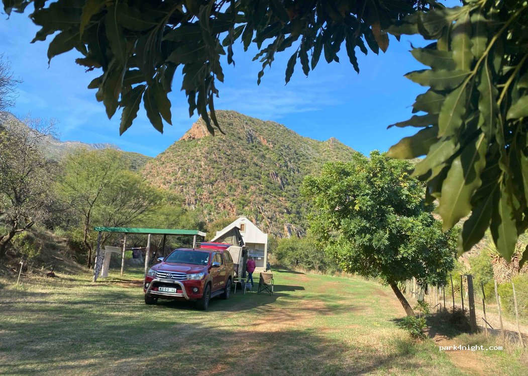 Überraschend gelegener Campingplatz auf einem Bauernhof im Meiringspoort in den Swartbergen, 150 Meter von der Hauptstraße entfernt. 10 Stellplätze mit Strom, Dusche und Wasser. 3 Plätze sind überdacht, um Regen und Sonne zu schützen. Die Stellplätze sind mit Gras bedeckt und bieten Blick auf die Berge. Ab dem Nachmittag liegt der Campingplatz im Schatten der Berge. Das Toilettengebäude ist modern und mit Handtüchern ausgestattet. Das Dorf De Rust mit Souvenirläden und einem Restaurant ist 1,5 km entfernt.