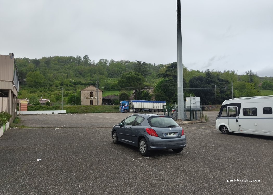 Discover the spacious parking lot of Le Raiz'to pizzeria restaurant, a convenient location for motorhomes. Enjoy the close proximity of a supermarket, laundromat, and car wash. Please note that the parking lot is located between a road and a railway line. It's a pleasant place to enjoy a pizza, do your laundry, and spend the night.