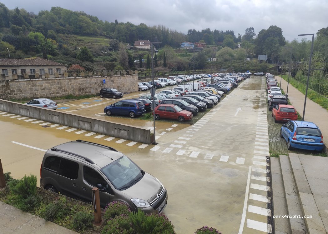 Large free day/night car parking lot on right side of road into Redondela. At least 100 spaces, no parking restriction signs. Probably not suitable for larger Motorhomes, as parking bays are normal car width/length but car campers and converted vans will have plenty of space. Nearly full at 11.30pm so must be used by local residents of Redondela.