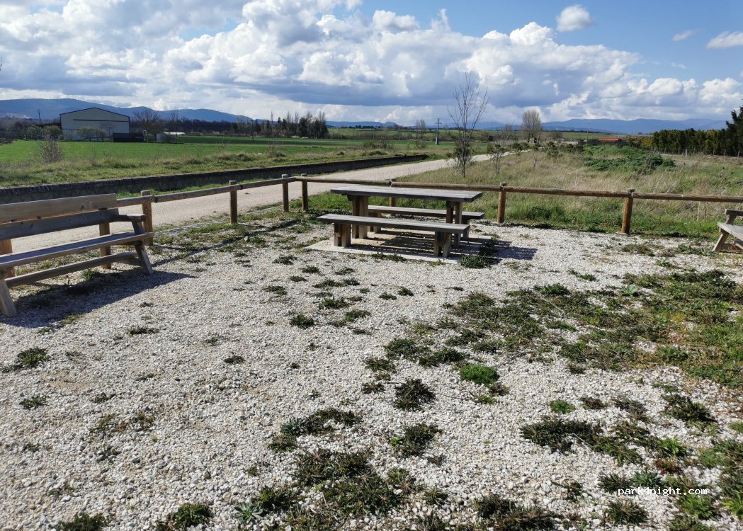 Aire de pique-nique à côté de l'ancienne gare au pied de la voie verte, elle dispose de quelques tables et bancs.