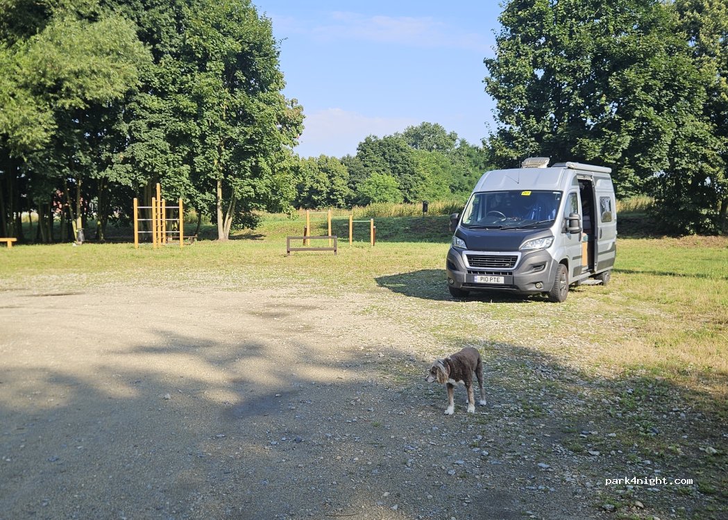Ein Parkplatz mit einem kleinem Spielplatz