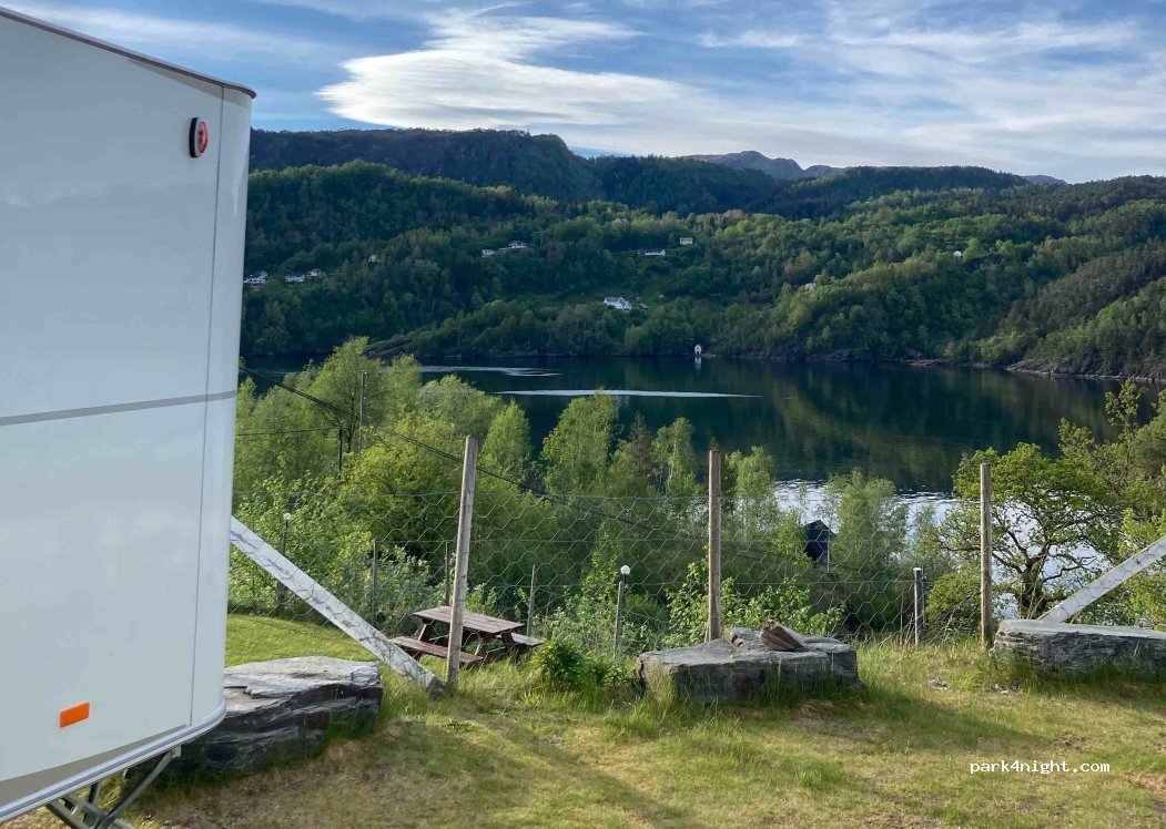 très belle vue sur le fjord. on peut accéder à un ponton et se baigner un peu plus bas. l'accueil est charmant. le terrain est divisé en plusieurs petites terrasses donc on a pas l'impression d'être les uns sur les autres. la cuisine est très petite, c'est juste un évier et un micro ondes et frigo. et il n'y a que 2 douches et 2 WC. la route est un peu bruyante mais pas passante la nuit.