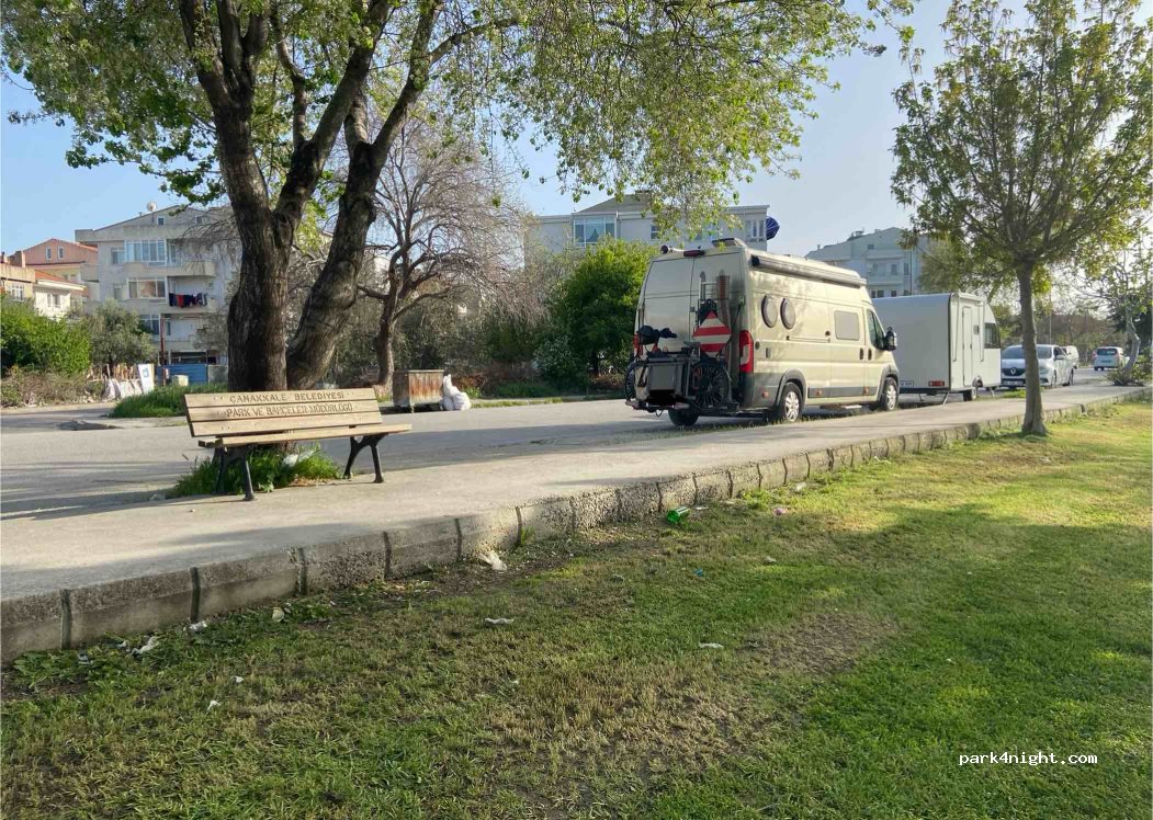 Opposite the market halls, between two pedestrian bridges along the side of the neighborhood street and the green riverbank, there are several parking spaces. Turkish mobile homes and caravans are parked here. Garbage containers are on the street, and trash cans are next to the park benches. A few vehicles are parked at night. We spent two nights here to do some shopping and other errands.