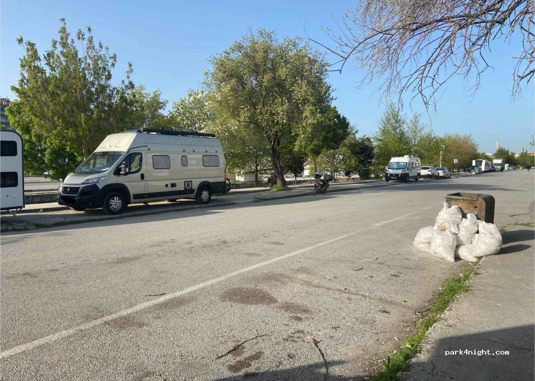 Gegenüber den Markthallen zwischen zwei Fussgängerbrücken längsseitig an der Quartierstrassenzuführung und dem begrünten Flussufer hat es mehrere Parkfelder. Hier stehen Türkische Wohnmobile und Wohnwagen. Müllcontainer an der Strasse und Mülleimer neben den Parkbänken. In der Nacht vereinzelte Fahrzeuge. Um diverses einzukaufen und zu erledigen haben wir hier zwei Nächte verbracht.