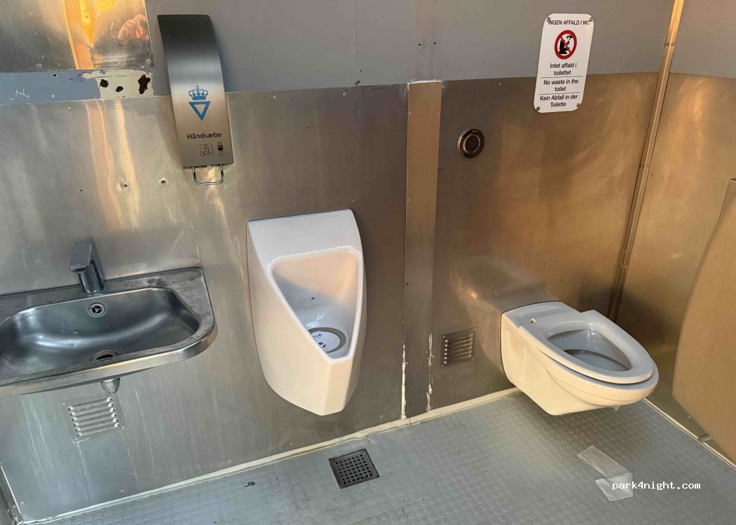 Nice rest area with tables, benches, trash cans and toilet (accessible for disabled people).