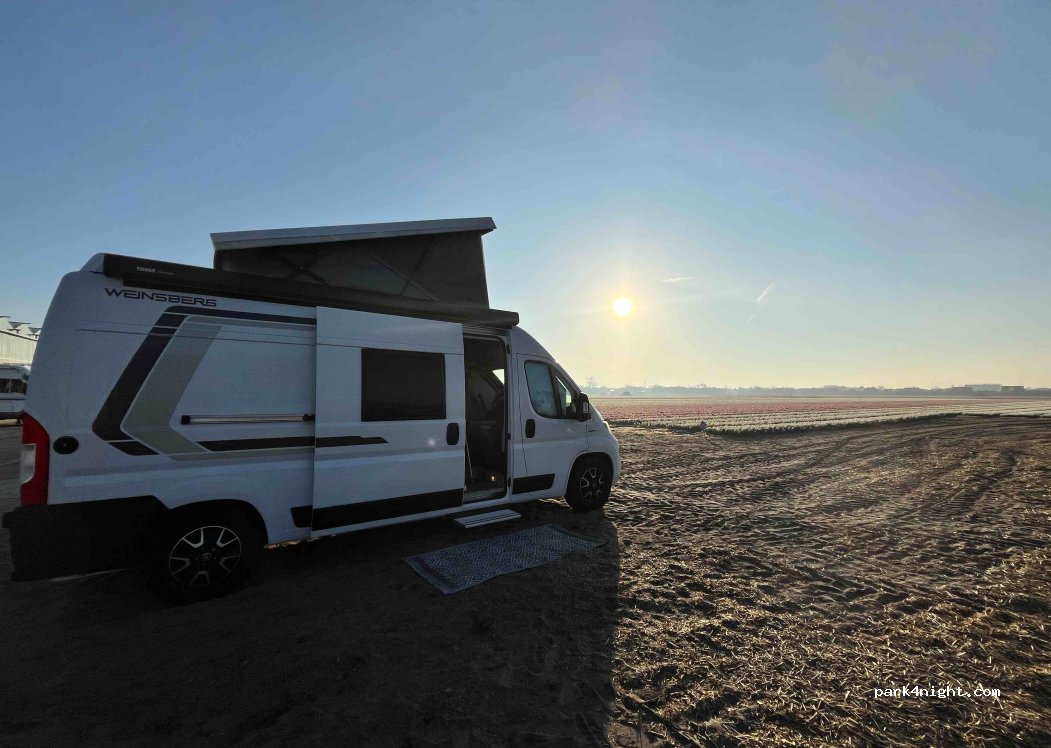 Potentieel 5*, maar moet nog veel gebeuren. Net begonnen als camperplaats, momenteel niet veel meer nog dan een 'parkeerplaats'. Er is elecriciteit en schoon water, toilet in kantine van de bollen-boerderij. Vriendelijke ontvangst. Verwacht (nog) geen aangelegde camperplaats.