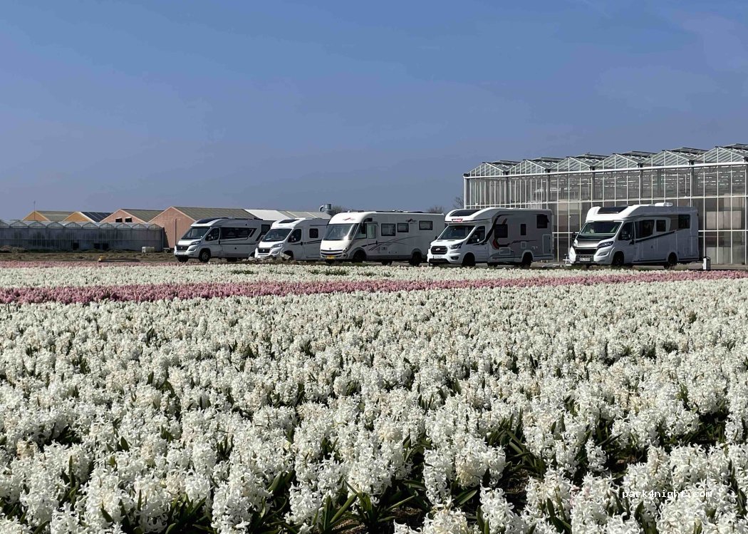 Aire d’accueil de 15 emplacements sur une exploitation d’un pépiniériste. Place bétonnée au bord d’un champ de jacinthes. Douche et Wc directement dans le hangar compris dans le prix de 25 euros, électricité également possible avec un supplément.