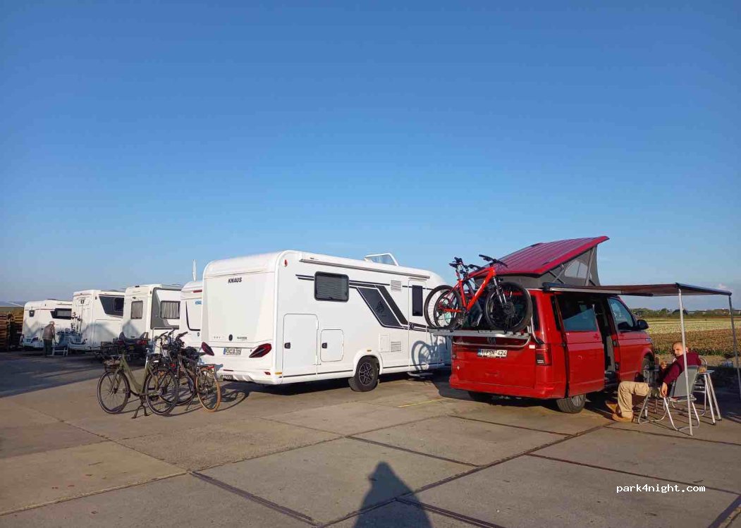 Ein schöner und ruhiger Ort direkt am Feld, von wo aus man mit dem Fahrrad tolle Touren machen kann. Eher ein Parkplatz, aber wir fühlen uns trotzdem richtig wohl. Toilette und Dusche durch die Hallen erreichbar. Wir hatten ursprünglich nur eine Nacht eingeplant, sind aber dann doch drei Nächte geblieben. Kommen gerne wieder. Wohnmobil mit 2 Personen 25 € die Nacht, mit Strom.