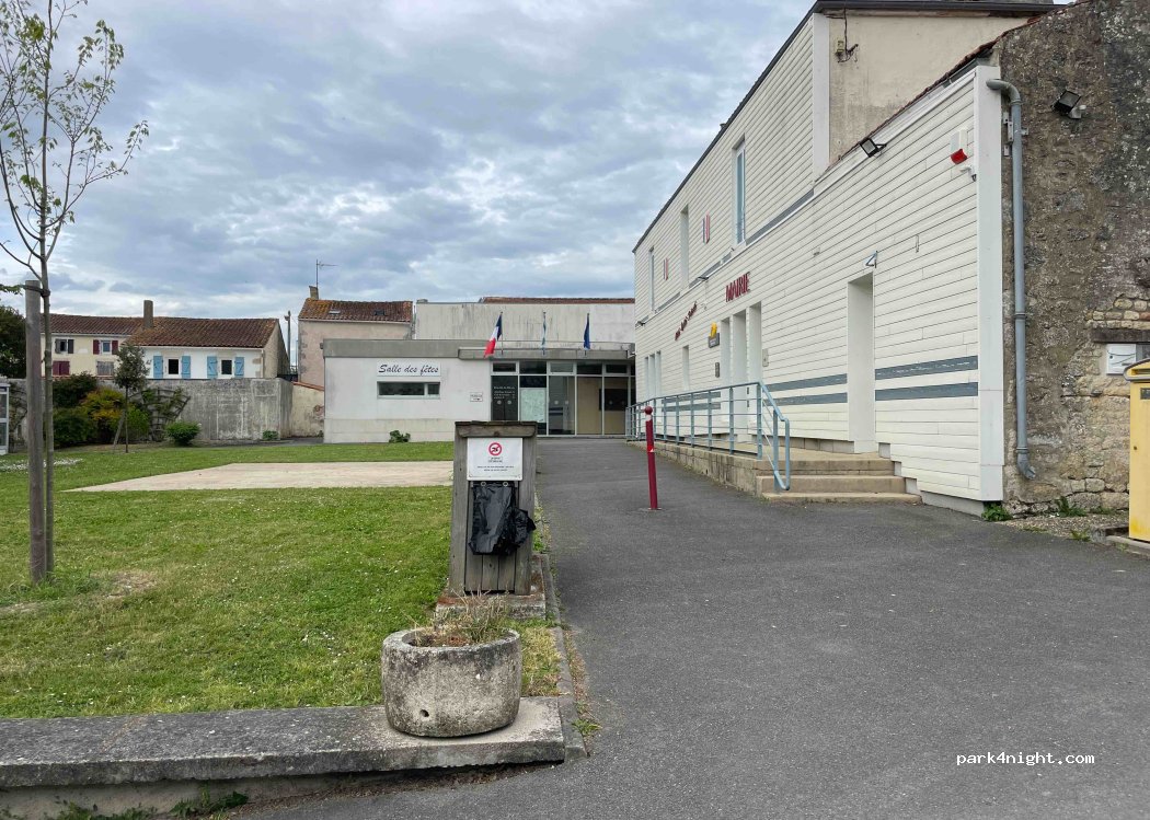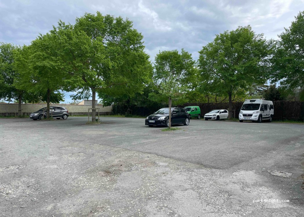 Vaste parking en enrobé, juste derrière l’église et près de la mairie, aucune interdiction apparente. en endroit, très calme et plat.