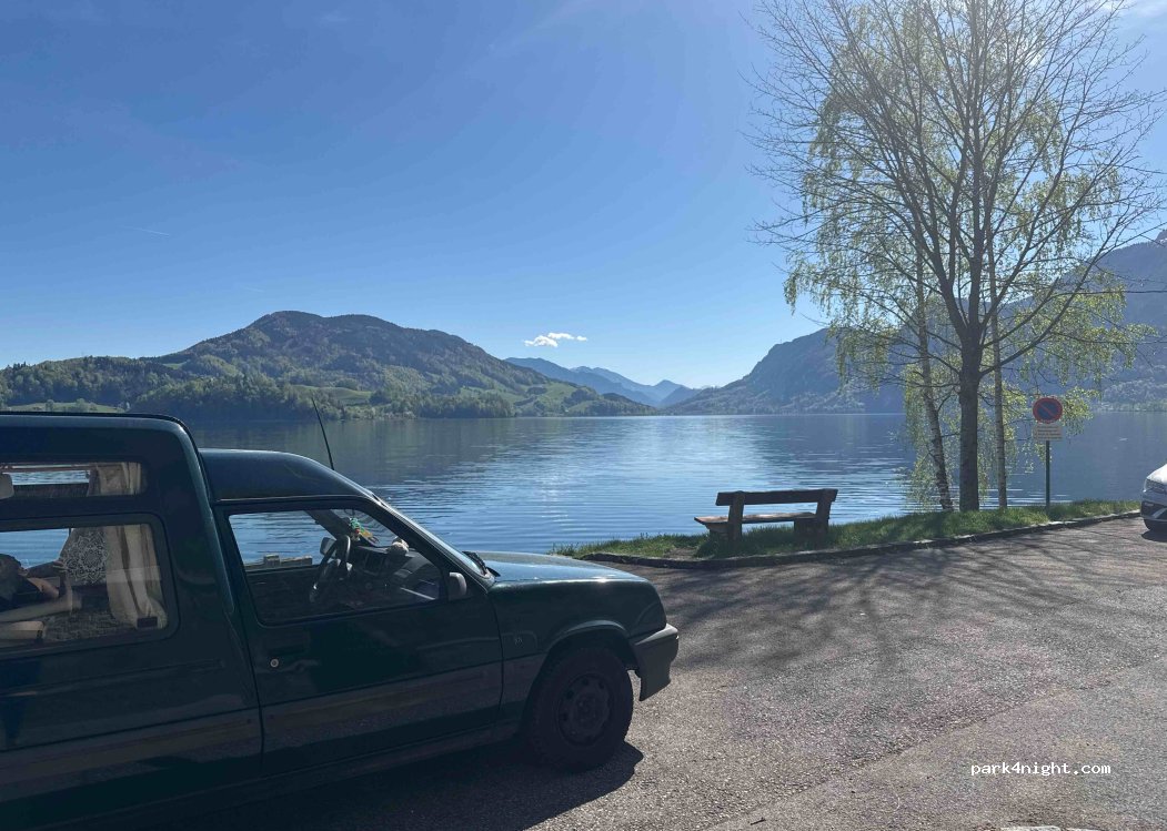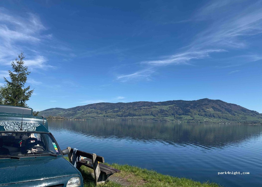 Bel espace pouvant accueillir jusqu'à 3 petits fourgons. De mai à fin septembre, le stationnement des camping-cars est interdit la nuit. Nous y avons passé une nuit tranquille en avril (malgré la route juste à côté). Accès direct au lac. Camping très propre, mais pas de poubelles, donc emportez vos déchets avec vous !