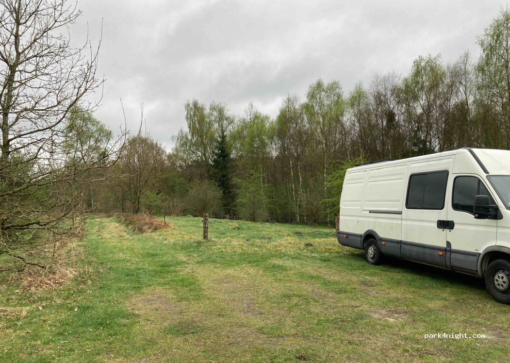 Pequeño estacionamiento para 1 o 2 furgonetas máximo. Cerca de una pequeña carretera que bordea el lago, con poco tráfico. Lugar al otro lado de la carretera, al borde de un pequeño prado boscoso.