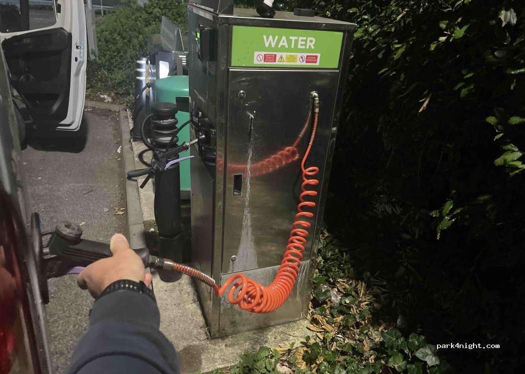 Kostenloser Wasserschlauch an der Luftsäule. Achtung! Ein Schlauch ist kostenpflichtig und enthält Scheibenwischwasser. Nicht verwechseln.